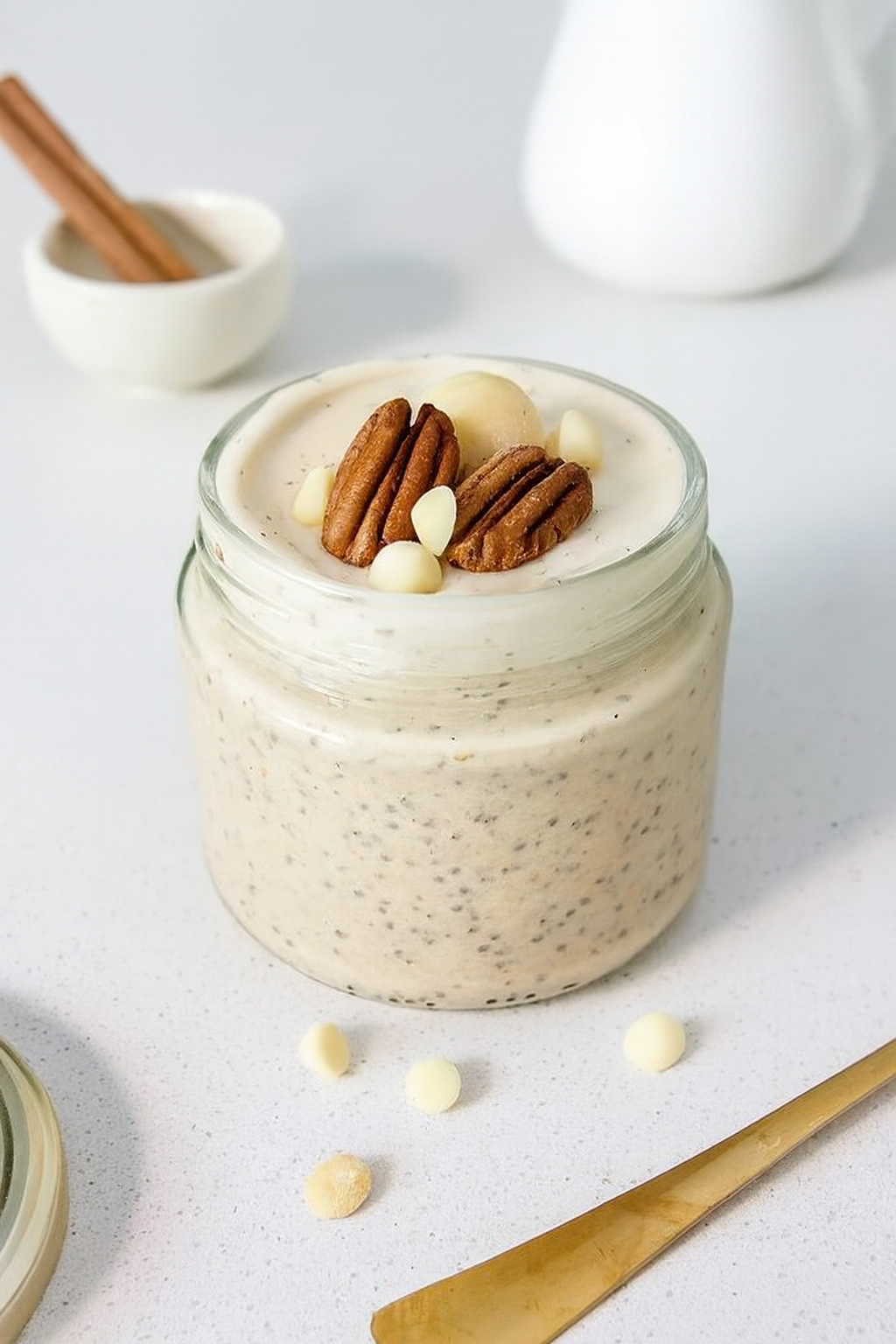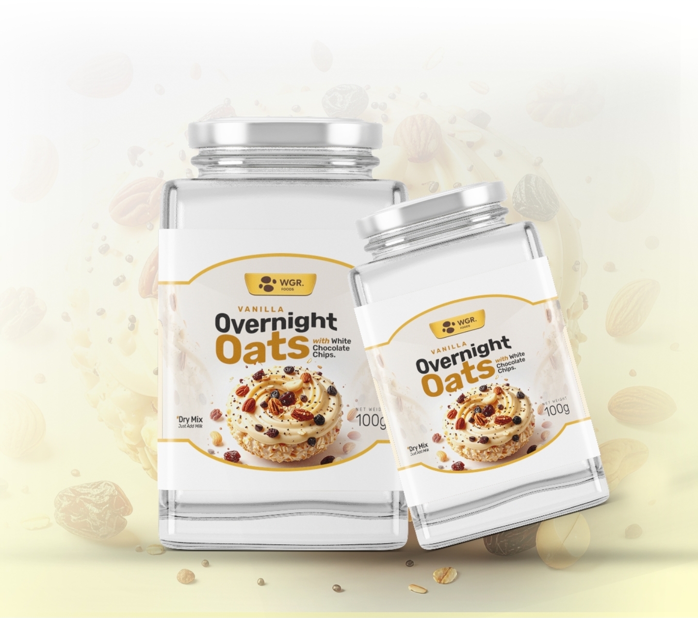 Vanilla Overnight Oats with White Chocolate Chips – Rolled Oats, Vanilla Plain Buttermilk Powder, Rasins, White Chocolate Chips, Mixed nut (Macadamia, Pecan, Almond, Hazel), Chia seeds.